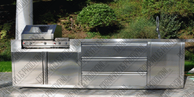 Mobile in stainless steel AISI 304 satin finish exterior complete with BBQ, sink and snacks.